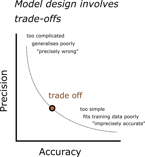 But surely you need a complicated model to understand a complex system? It turns out that this is frequently not true. Ironically, understanding a complex system can become easier when interpreting a simple model. At Arcadis Gen we’re very aware of the trade-offs that have to be made when modelling. At one extreme it is possible to build a complicated and precise model, but one that makes inaccurate predictions because it does not generalise in the real world. At the other extreme is a simple model that is easily understood and can make accurate predictions, but lacks the precision to be useful. The first model might predict your asset effective age to be 1000.1338273 years old (precisely wrong); the second might predict it to be between 0 and 80 years (accurate but imprecise). The sweet spot lies somewhere inbetween, where a model is understandable and defendable yet yields insights into the dominant causal relationships at work.